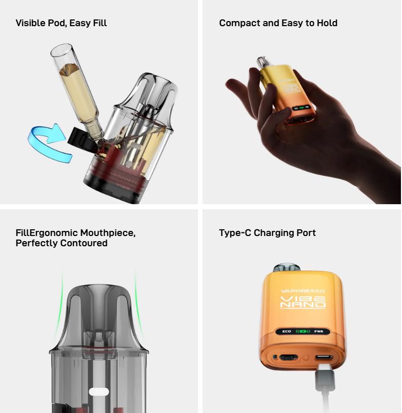A pesar de su tamaño reducido, el Vibe Nano tiene un diseño optimizado para una batería de larga duración y un pod de 4,5 ml, lo que te permite vapear todo el día sin preocuparte por recargar. Su cuerpo compacto y ergonómico es fácil de sostener, y el pod visible permite un control rápido del nivel de líquido. Además, su sistema de llenado es rápido y sencillo, ideal incluso para quienes usan sistemas abiertos por primera vez.